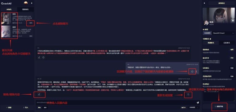 3、在聊天对话框中,可自由清空聊天内容,重新开始与角色的新聊天;也能点击其他角色卡切换聊天等