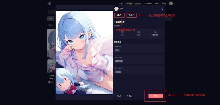 2、选择角色,可以查看角色介绍;点击开场白,可以切换并查看角色开场白;点击聊天能创建故事并开始聊天