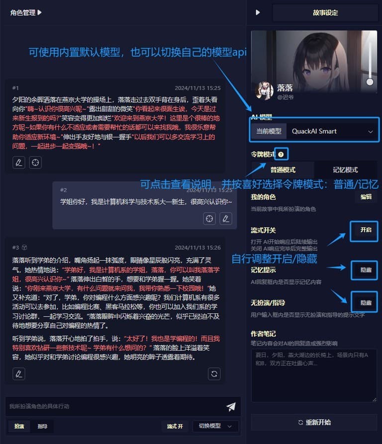 QuackAI云酒馆可以让用户免费搭建酒馆,从而和自己创造的虚拟角色去聊天互动,对方会句句有回应,每一次都能根据它的想法去回答你的问题,就像真人聊天一样。