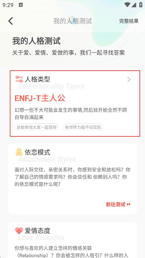 4、在发现栏目中,用户可以查看自己的人格类型也可以进行心理测试,同时用户可以加入当前热门讨论专区进行讨论,还有多种文章精选让用户查看。